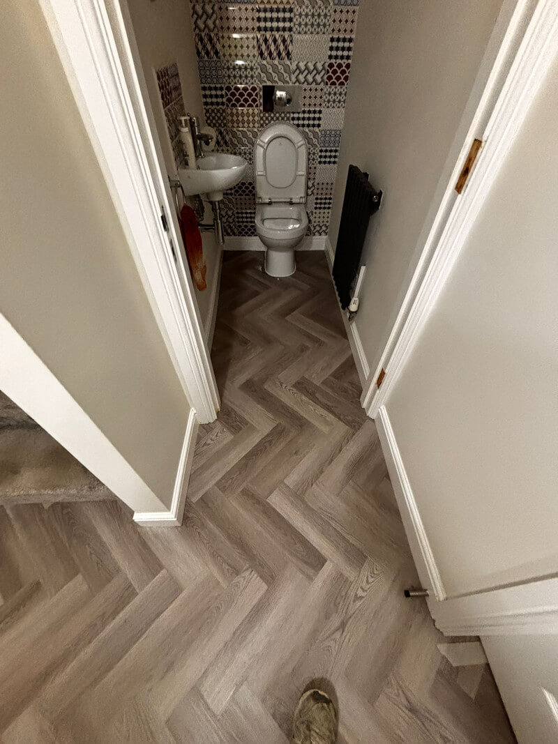 Once the screed had set, we then installed the luxury vinyl flooring. Our clients chose Brampton Chase, heather grey herringbone. You can see what the flooring looks like now installed from the photographs attached. The beautiful wood effect gives the illusion of traditional parquet flooring with the more modern features that accompany luxury vinyl flooring.